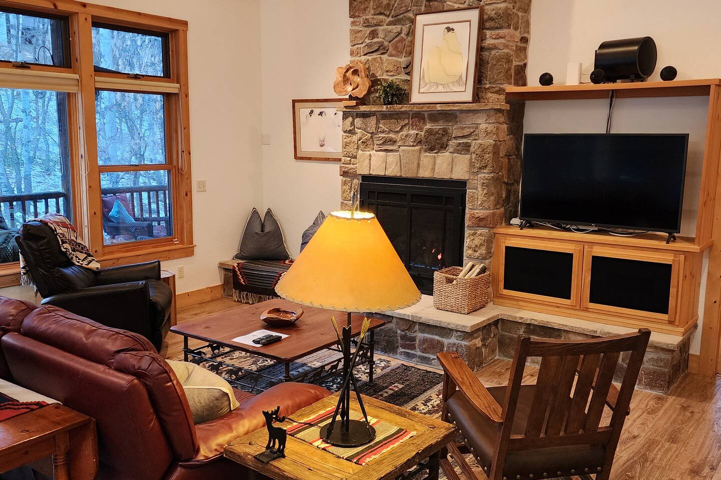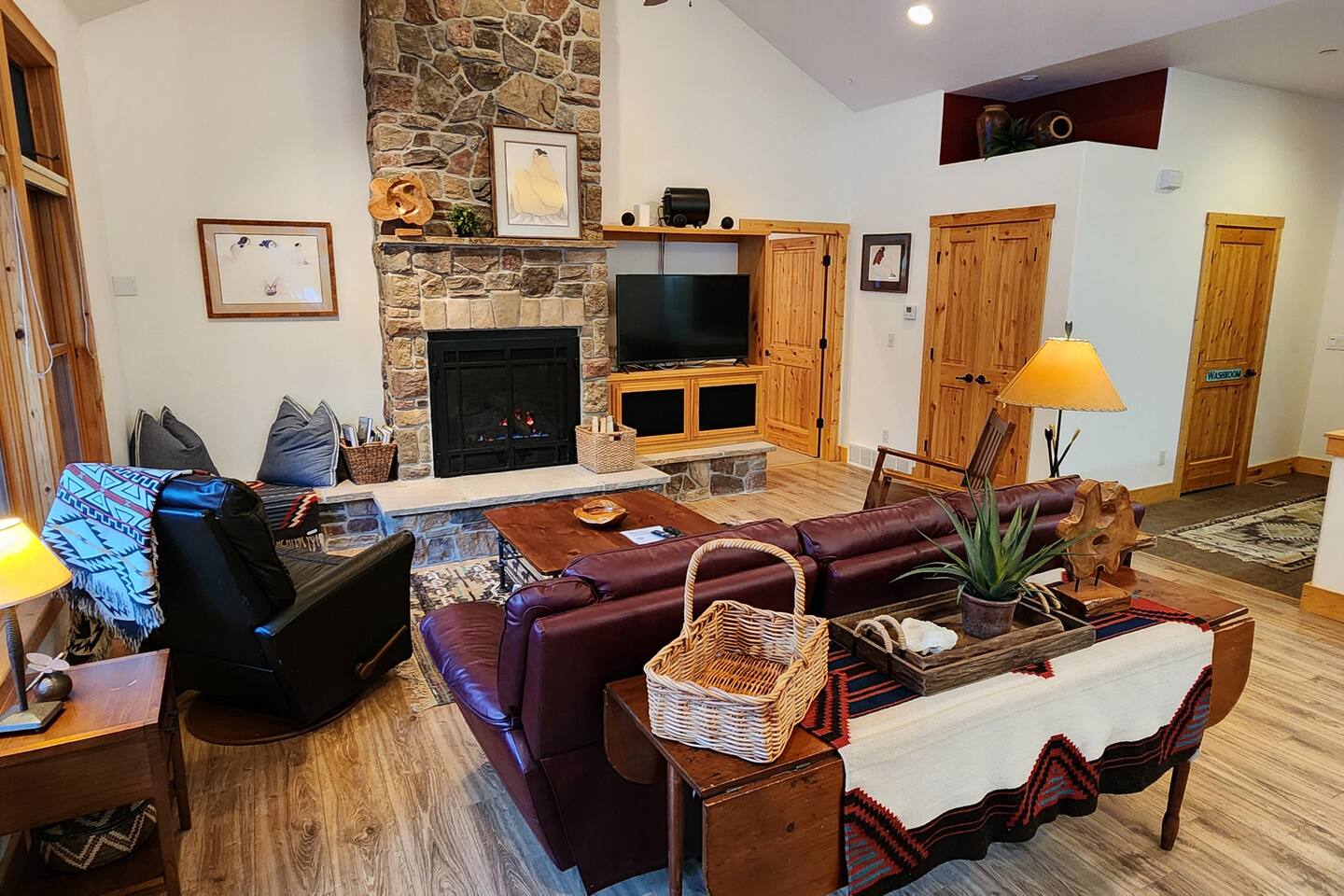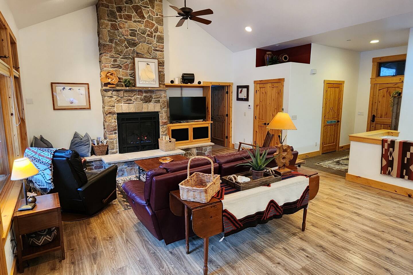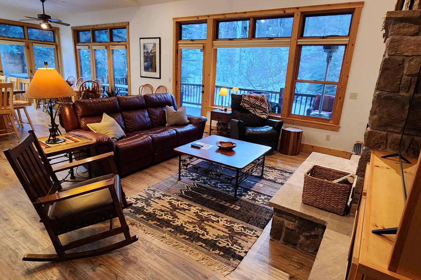 Escape to this stunning cabin nestled in the heart of Sundance, offering a perfect blend of luxury and mountain charm. This beautifully appointed 3-bedroom cabin is ideal for a relaxing retreat with family or friends, featuring soaring vaulted ceilings, cozy interiors, and modern amenities throughout. ✓ NO CHORES ✓ Hi-speed Wi-Fi ✓ Up to 8+ guests ✓ Three-bedroom home with 3.5 bathrooms ✓ Gas Fireplace ✓ Dining area with a large table for family games ✓ Fully equipped kitchen